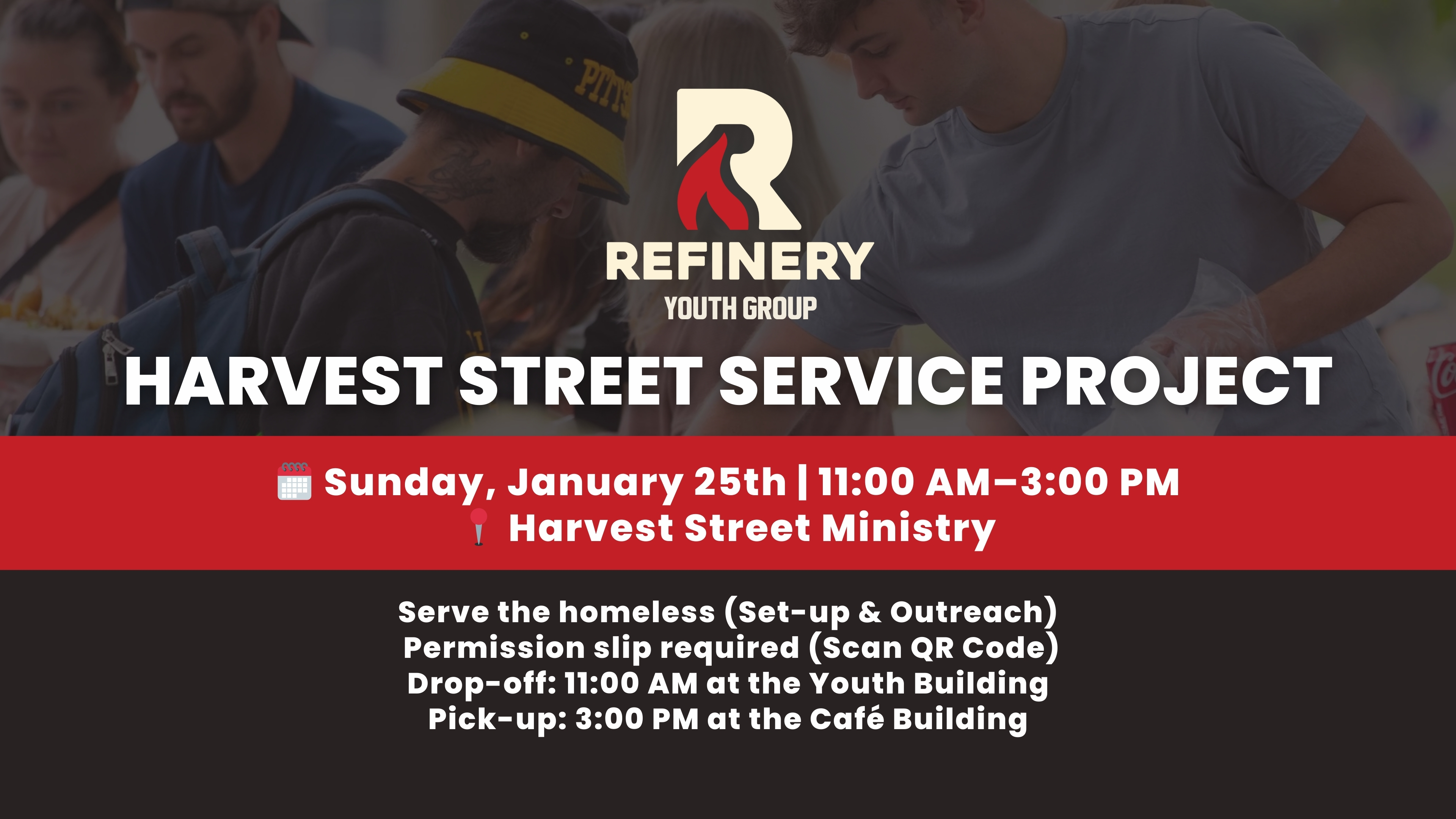 On Sunday, January 25th, students will participate in the Harvest Street Service Project, serving our community through set-up and outreach to individuals experiencing homelessness. Students should arrive at the Youth Building at 11:00 AM and will return for pickup at 3:00 PM at the Café Building.